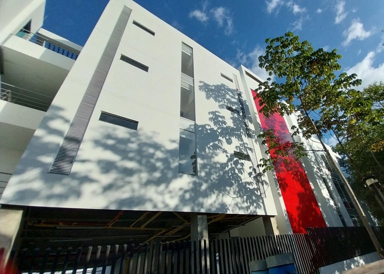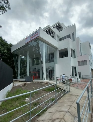 Barandas metálicas, fachadas en alucobond rojo institucional, fachada principal en vidrio soportes en acero inoxidable, aluminio, vidrio templado perforado y el equipo DACTIL ID interdisciplinario, ejecutan este proyecto para hacer perfecta la experiencia del cliente en este edificio empresarial.